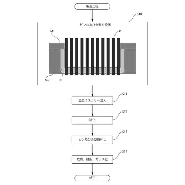 (d)前記成形型に、前記スラリーと硬化剤とを混合して注入し、混合物を硬化させ前記形状を有する成形体を形成する工程とを備える製造方法。