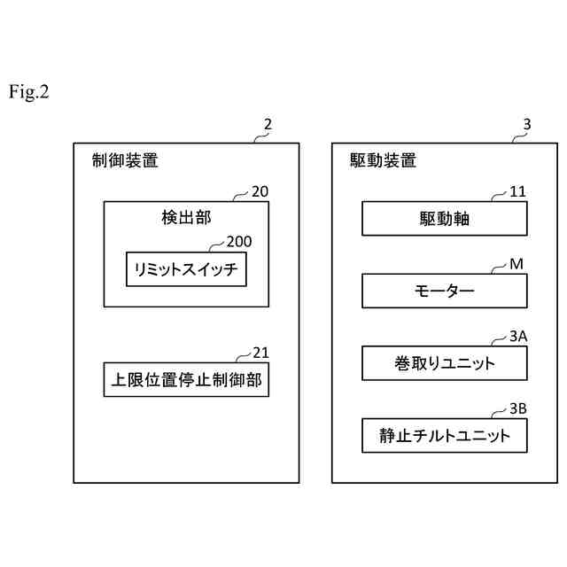 【解決手段】この発明は、ヘッドボックス1と、スラット4およびボトムレール8と、制御装置2および駆動装置3と、を備える。駆動装置3は、駆動軸11と、モーターMと、巻取りユニット3A、5bと、静止チルトユニット3B、5aと、を有する。制御装置2は、検出部20と、上限位置停止制御部21と、を有する。上限位置停止制御部21は、スラット4およびボトムレール8が上限位置に位置すると、モーターMの正回転を停止させて、モーターMを所定角度逆回転させて、スラット4およびボトムレール8の下降作動を準備する。この結果、この発明は、スラット4およびボトムレール8を下降させる操作が簡便である。