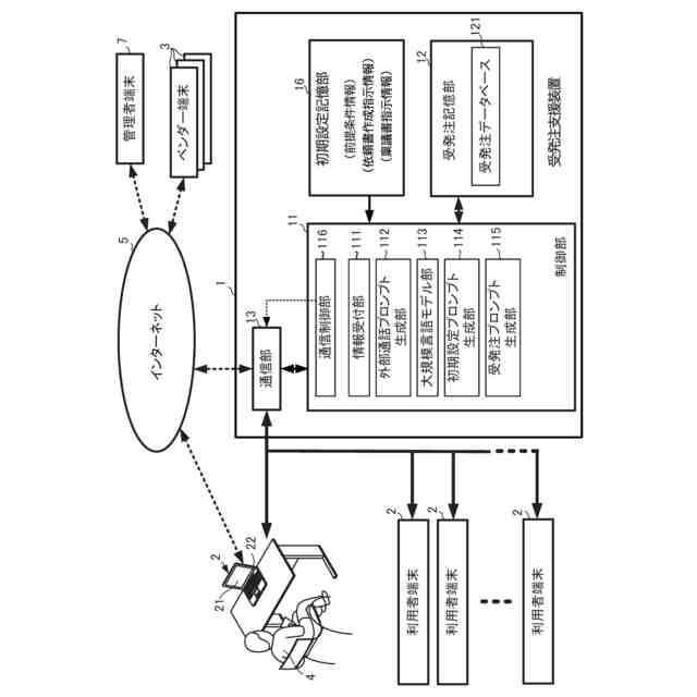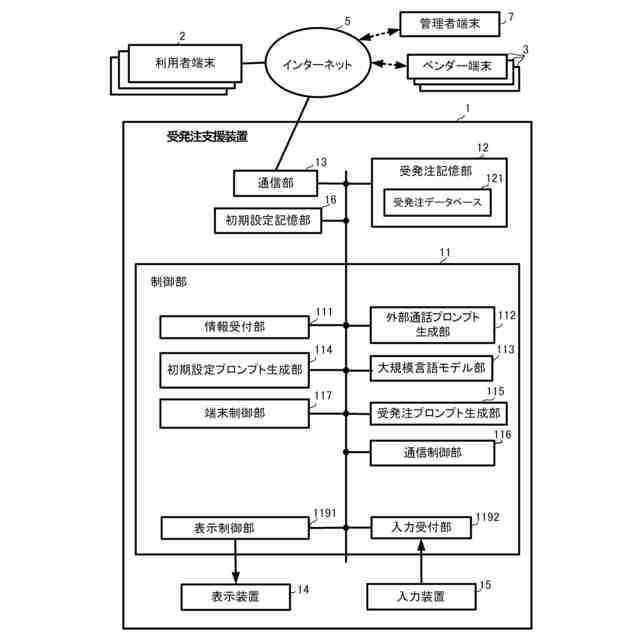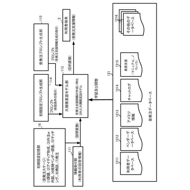 【解決手段】本発明の受発注支援装置1は、受発注データベース121の受発注関連情報に基づいて、プロンプトで与えられた単語や文章が自然言語としてどのように起こりやすいかを確率的に予測し、受発注支援情報を生成するように学習及び調整が行われることで、受発注支援情報の作成に特化された大規模言語モデルを有した大規模言語モデル部113と、利用者4との会話における利用者4の回答情報を受け付ける情報受付部111と、大規模言語モデルにおける受発注支援情報の生成の前提条件として指示する初期設定プロンプト生成部114と、前提条件に基づいて受発注ステージに適合した受発注支援情報を大規模言語モデルに生成させる受発注プロンプト生成部115とを有している。
