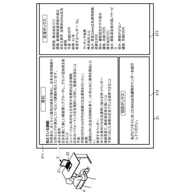 本発明者らは、上記課題を解決するために鋭意検討した結果、受発注支援情報の作成に特化された大規模言語モデルを利用し、利用者の課題の受付けからベンダーへの発注に至るまでの受発注ステージに従った会話を利用者との間で行うことによって、上記の目的を達成できることを見いだした。そして、本発明者らは、本発明を完成させるに至った。具体的に、本発明は以下のものを提供する。