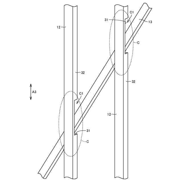 建物の外壁や界壁の内部にブレース(斜材)を設けて、壁の強度を高めることがある。ブレースは、通常、壁面材が固定されるスタッド(間柱)に干渉しないように配置されるが、壁内部におけるスタッドの配置形態などにより、スタッドに干渉する位置に配置されることがある。この場合、スタッドの上下方向の一部(ブレースとの干渉部位)のみ、スタッドの奥側(後方端部)を切り欠くなどの対応がとられる。