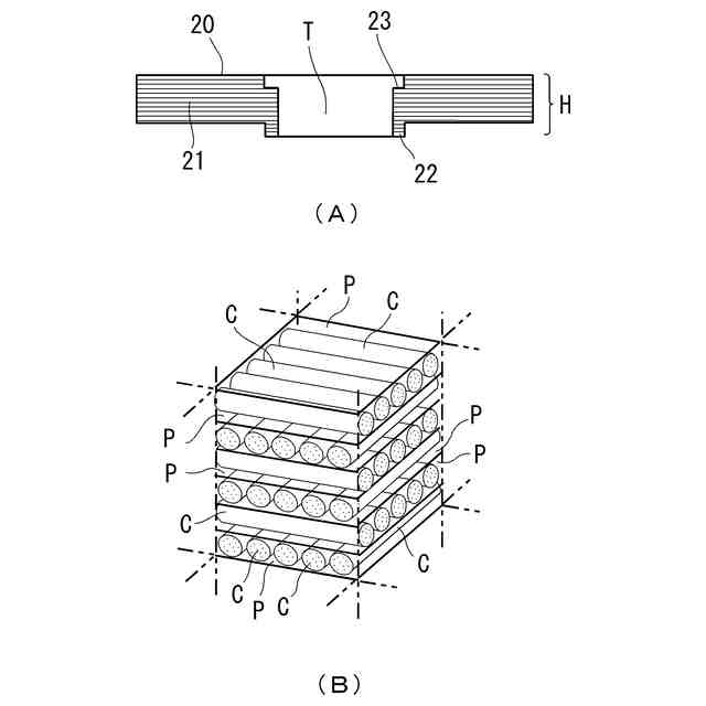 前記積層構造の単一層における前記炭素繊維は、前記マトリックス樹脂を介して単一方向に並列して延び、かつ、隣り合う前記炭素繊維の間に間隔を保つように配置され、かつ、