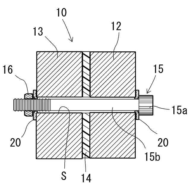 加振体2、被振体3および弾性体4にはボルト孔Sが貫通し、このボルト孔Sにボルト5の軸部5bが通される。この軸部5bにナット6が締め付けられて加振体2、被振体3および弾性体4が固定される。加振体2および被振体3のボルト5による締付面(ボルト5の頭部5aとナット6の締付面)には緩み止めのためのワッシャ7,7が設けられる。