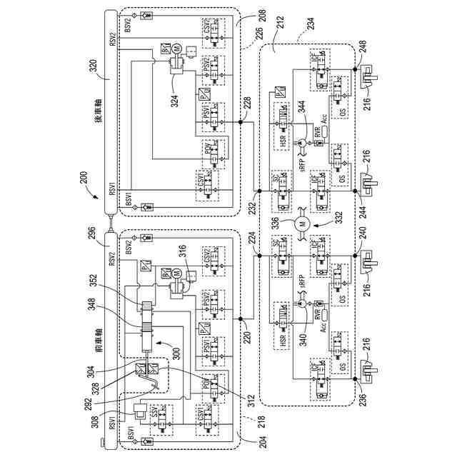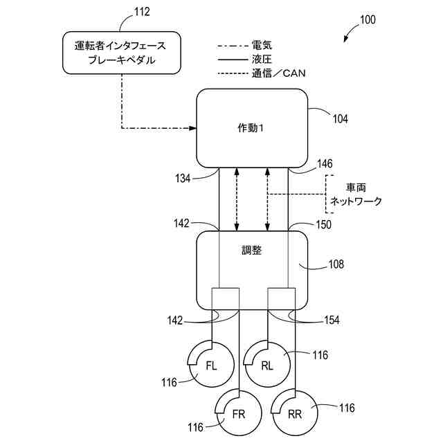図2に示されているように、作動モジュール104は、ブレーキペダル112が入力部124を介してマスタシリンダ120を直接に作動させるように、入力部124を介してブレーキペダル112と直接に関係するマスタシリンダ120を含む単一のユニットである。車両制動システム100は、2つの別個の制動回路、すなわち、第1の制動回路及び第2の制動回路をさらに含む。第1の制動回路は、前車軸のホイールシリンダ116を作動させる役割を担い、第2の制動回路は、後車軸のホイールシリンダ116を作動させる役割を担う。図示されている構成においては、前車軸は、2つのホイールシリンダ116を含み、後車軸は、2つのホイールシリンダ116を含む。各制動回路は、作動モジュール104から、調整モジュール108内に入り、これを介して4つのホイールシリンダ116のうちの2つまで延在している。第1の制動回路は、作動モジュール104の第1のポート134から調整モジュール108のポート138を通り、調整モジュール108の第1のポート対142を介して4つのホイールシリンダ116のうちの2つに流体を送るように動作可能である。第2の制動回路は、作動モジュール104の第2のポート146から調整モジュール108のポート150を通り、調整モジュール108の第2のポート対154を介して4つのホイールシリンダ116のうちの2つに流体を送るように動作可能である。