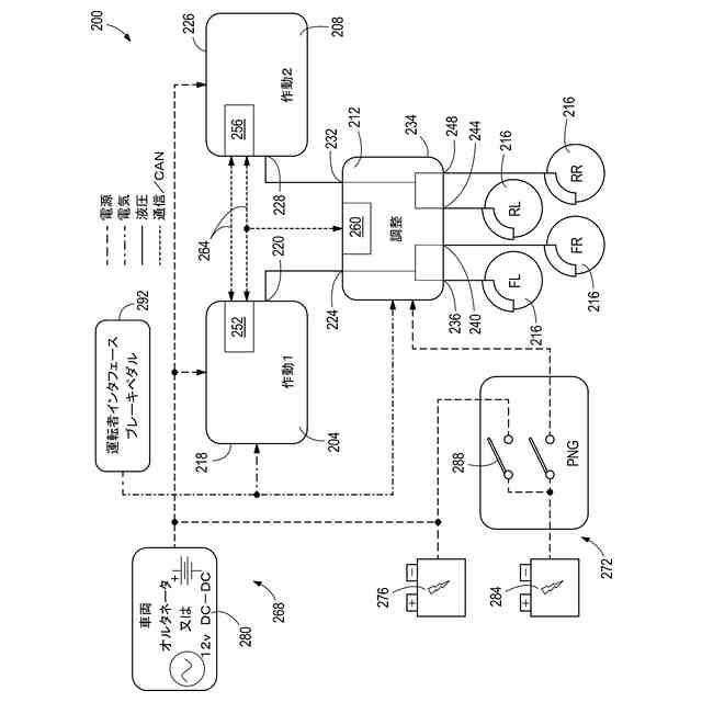 図1及び図2には、既知の構成の車両制動システム100が概略的に示されている。車両制動システム100は、4536kg(10000ポンド)までの総車両重量定格(GVWR)を有する乗用車及び軽トラック(例えば、クラス1及びクラス2)において使用することができる。車両は、米国では連邦高速道路局(FHWA)である政府機関によりGVWRによって分類され、軽量車両としてクラス1及びクラス2、中型車両としてクラス3乃至クラス6、大型車両としてクラス7及びクラス8に分類される。クラス3乃至クラス6の車両は、4536kg乃至11793kg(10001ポンド乃至26000ポンド)の間のGVWRを有し、クラス7及びクラス8の車両は、これを上回る(26001ポンド以上)のGVWRを有する。具体的には、クラス3の車両は、4536kg乃至6351kg(10001ポンド乃至14000ポンド)の間のGVWRを有し、クラス4の車両は、6352kg乃至7257kg(14001ポンド乃至16000ポンド)の間のGVWRを有し、クラス5の車両は、7528kg乃至8845kg(16001ポンド乃至19500ポンド)の間のGVWRを有し、クラス6の車両は、8846kg乃至11793kg(19501ポンド乃至26000ポンド)の間のGVWRを有する。4536kg(10000ポンド)未満のGVWRを有する車両は、以下においてさらに説明するように、単一の作動ユニット及び単一の調整モジュールを含む制動システム100を使用することができる。