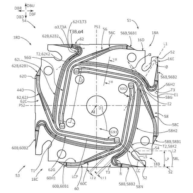 本発明は、US2019/0240741に記載の出願人の以前の発明に対する改良形態である。本発明は、図18B~図20Bに示す4方刃先交換式突切りブレードに限定されないが、確かに、例えば、図21A~図23Dの少なくとも3方刃先交換式ブレードにも適用可能である。本出願で解決される冷却剤通路の難点を図18B~図20Bの実施形態を参照して述べるため、4方刃先交換式突切りブレードについて述べる。