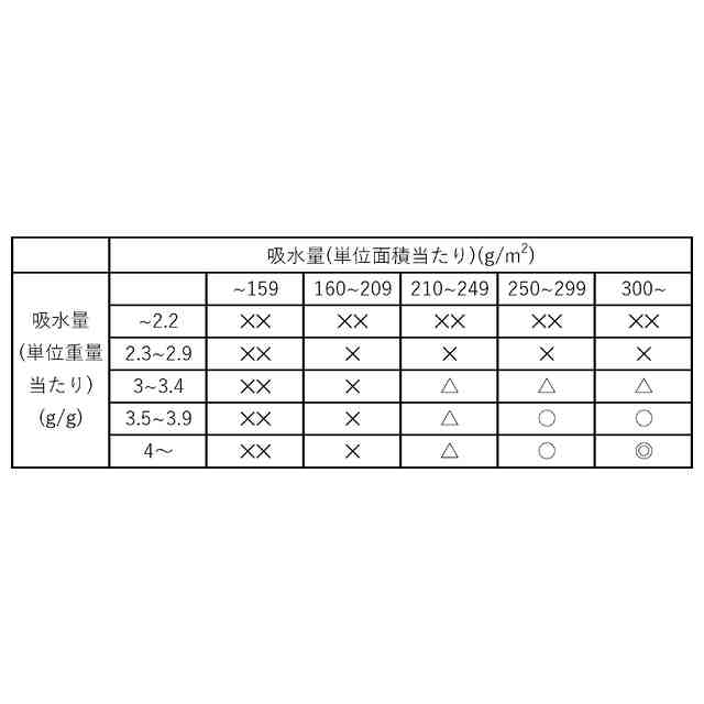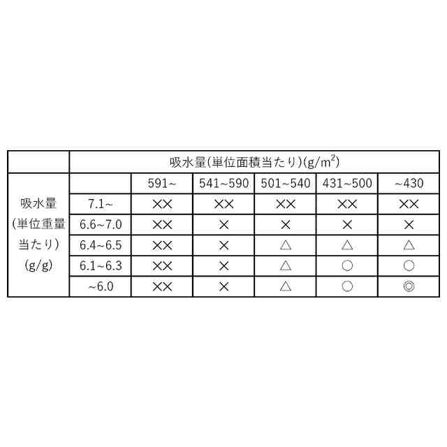 以下、単位重量当たりの吸水量が3.0g/g以上6.5g/g以下であり、