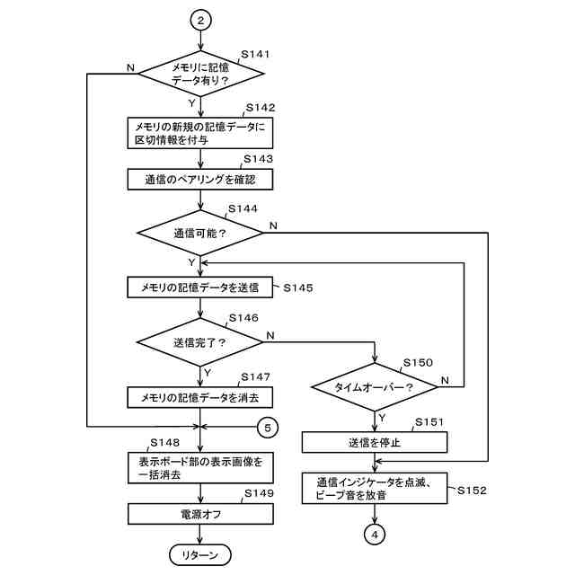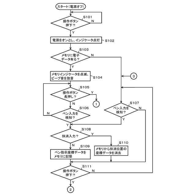【解決手段】手書き入力された情報を表示する表示部と、手書き入力された情報に対応した位置を検出する位置検出センサと、手書き入力された情報に対応した電子データを記憶するメモリと、制御回路とを備える。手書き入力された情報は、使用者の所定の操作に対応して、一括して視覚的に消去可能とされている。制御回路は、所定の操作に対応して、メモリに記憶されている表示面上での手書き入力操作に対応した電子データに対して区切り情報を設定する。