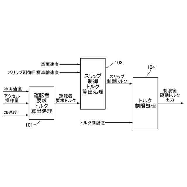 車両制御装置17は、後輪用レゾルバ13、アクセル操作量を検出するアクセルペダルセンサ22、ブレーキ操作量を検出するブレーキセンサ23、ギヤ位置センサ24等の各種センサから情報を取得し、車両の統合制御を行う。車両制御装置17は、ドライバのアクセル操作やブレーキ操作等に応じた要求トルクに対し、要求配分トルクに応じてリアモータ7が出力すべき運転者要求トルクを出力する。