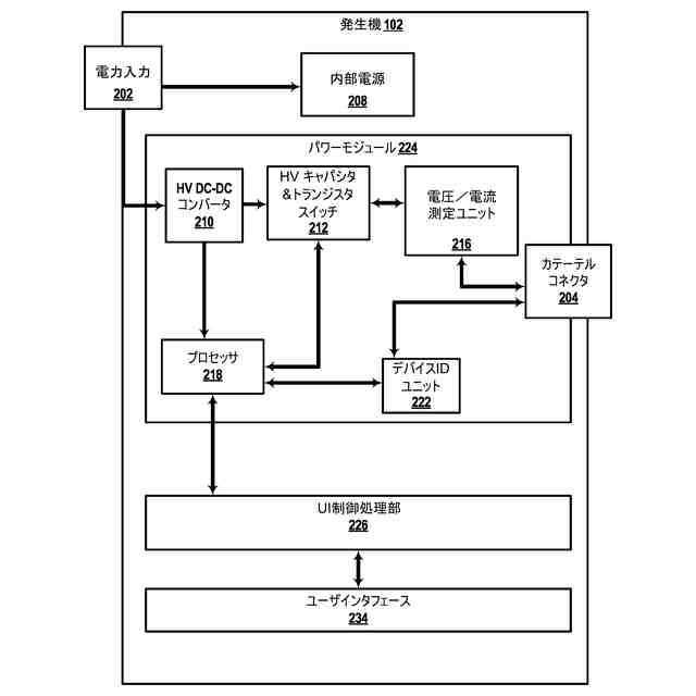 いくつかの例では、前記火花ギャップは、第1火花ギャップを備え、前記電子エミッタは、第3電極をさらに備え、前記第3電極は、前記第2電極と前記第3電極との間に第2火花ギャップを画定するように配置されている。いくつかの例では、前記第1電極、前記第2電極および前記第3電極は、前記ハイポチューブの共通の円筒表面の全部分である。いくつかの例では、前記第1電極および前記第3電極は両方とも、丸みを帯びた三角形形状を画定し、前記第2電極は、平行四辺形形状を画定する。いくつかの例では、前記第1電極、前記第2電極および前記第3電極は全て、平行四辺形形状を画定する。