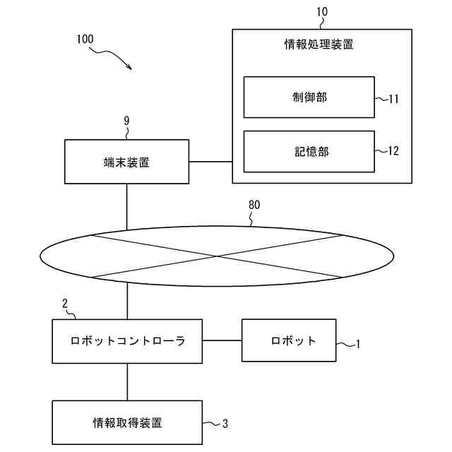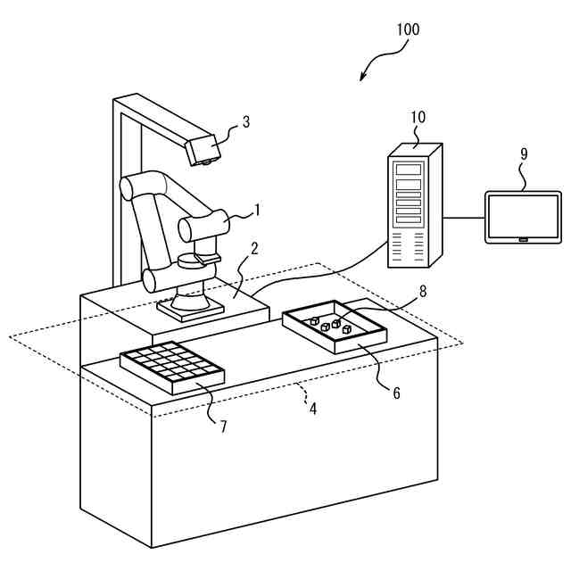 図1及び図2に示されるように、一実施形態に係るロボット制御システム100は、ロボット1と、ロボットコントローラ2と、情報取得装置3と、端末装置9と、情報処理装置10とを備える。ロボット制御システム100は、作業環境4に位置する作業台5の上に配置されている物体に対してロボット1に作業を実行させる。具体的に、例えばロボット1は、第1トレイ6に収容されているワーク8を、第2トレイ7に移動させることができる。