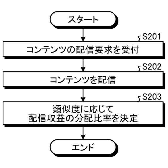 公開されている既存の1次創作物データと、前記1次創作物データの利用者によって創作された2次創作物データとに基づいて、前記1次創作物データと前記2次創作物データの類似性を判定する、