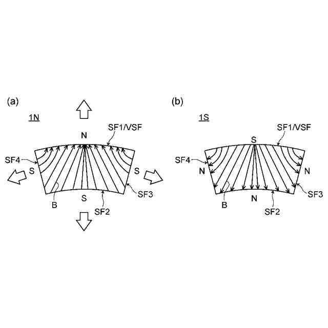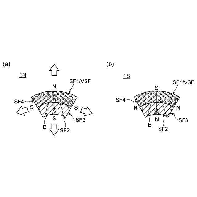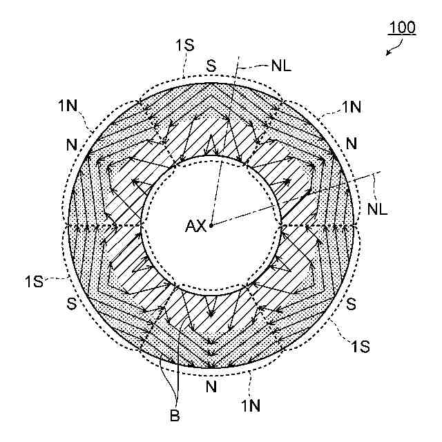 図30に示すように、磁石集合体900は円筒形状をした外周側の磁石集合体900EXと内周側の磁石集合体900INとからなっている。外周側の磁石集合体900EXは、磁化方向が磁石集合体900EXの法線NLに対し角度θHEXで傾いた極異方性配列をなしている。角度θHEXは45度を超え90度に近い角度となっており、換言すると外周面の接線(図示は省略)とのなす角度が比較的浅い磁化方向である「水平系の極異方性配列」の磁石集合体となっている。一方、内周側の磁石集合体900INは、磁化方向が同法線NLに対し角度θHINで傾いた極異方性配列をなしている。角度θHINは0度以上45未満の角度となっており、換言すると内周面の接線(図示は省略)とのなす角度が比較的深い磁化方向である「垂直系の極異方性配列」の磁石集合体となっている。