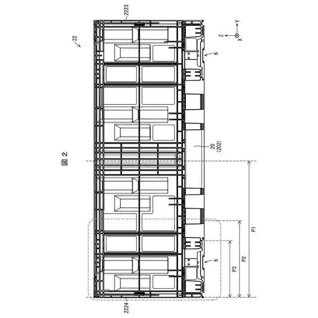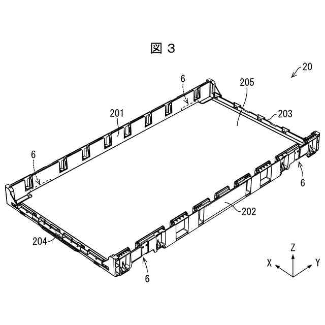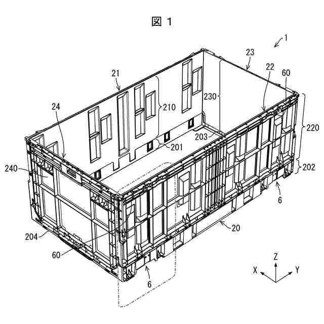 図1は、本実施形態の容器1の斜視図である。容器1は、平面視略矩形状の容器であり、底壁構成部20と、相対する長側壁21,22と、相対する短側壁23,24とを含み、上方に開口する略箱状をなしている。また、容器1は、底壁構成部20(の底壁部205)の上方で各側壁21~24の内側の収容空間(収容部)に物品を収容できる構成である。