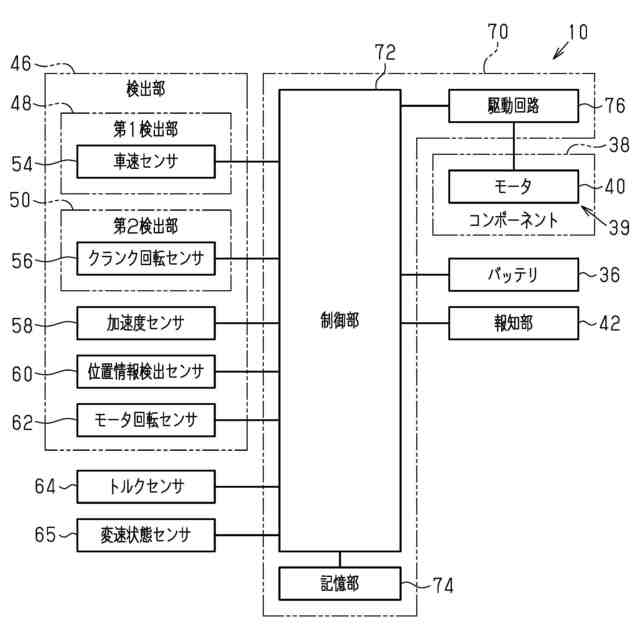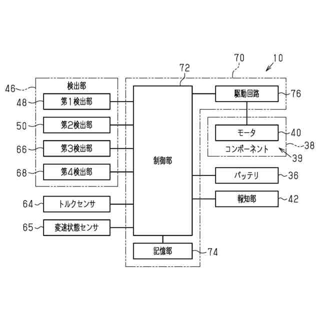 第2側面の制御装置によれば、クランクに入力される人力駆動力が予め定める駆動力よりも大きい場合、かつ、第1検出部の出力が第1状態ではない場合、コンポーネントを好適に制御できる。