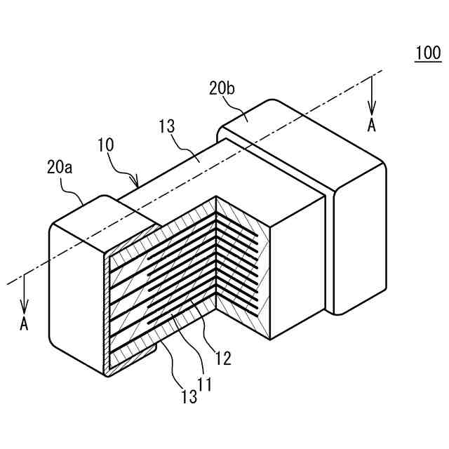 前記対向する2端面から前記積層チップの4側面のうち少なくとも1つの側面にかけて形成された1対の外部電極と、を備え、