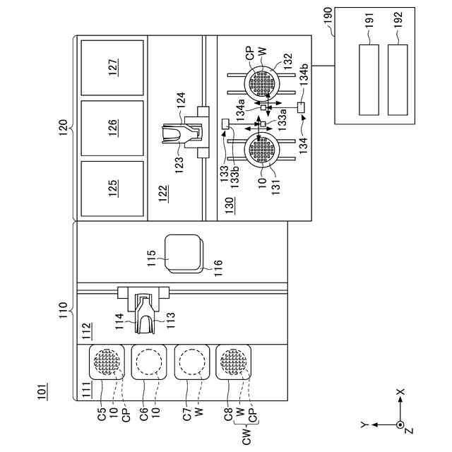 図1~図5を参照して、第2チップ処理システム201の一例について説明する。第2チップ処理システム201は、図2(A)~図2(C)に示すように、テープTPを介してフレームFRに装着されたチップCPを、テープTPからチップキャリア10に移し替える。これにより、チップCPを再配列する。