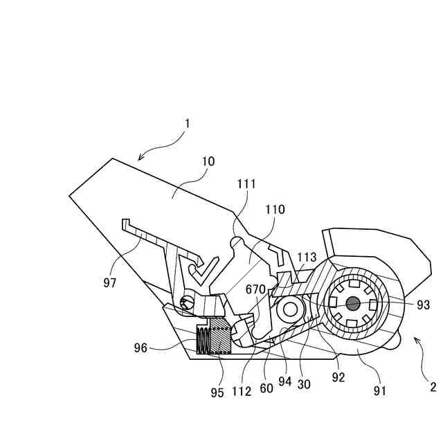【解決手段】この現像カートリッジは、現像電極60と第1レバー110を備える。現像電極60は、第1孔67を有する。第1レバー110は、一端部111、他端部112、およびカム面113を有する。一端部111が駆動力を受けた場合、第1レバー110は、カム面113を中心として移動する。そして、第1孔67に挿入された第1レバー110の他端部112が、第1孔67の内面670を押圧する。これにより、現像カートリッジ1を動かすための力を加えることができる。また、現像電極60とは別の部材を押圧する場合よりも、現像カートリッジの部品点数を低減できる。