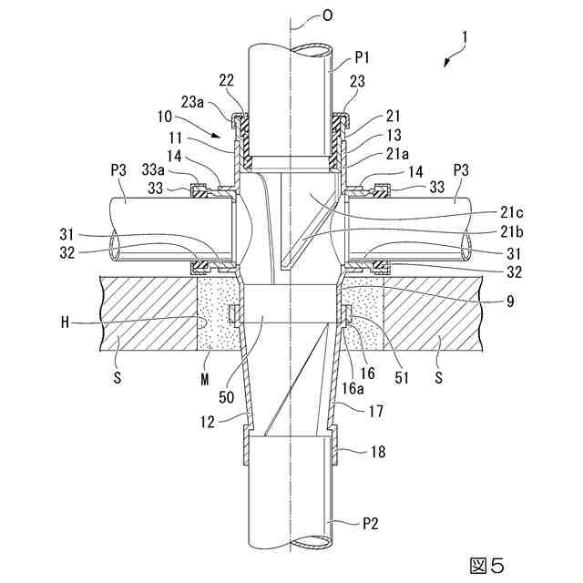火災時に火炎や煙によってスラブと貫通孔周りが加熱された場合、中間管に含まれる熱膨張性耐火材料が膨張し、上部接続管と下部接続管の接続部分を閉塞する。このため、下の階の火炎や煙が上の階に伝わることを防止でき、火災の延焼防止効果を発現する。