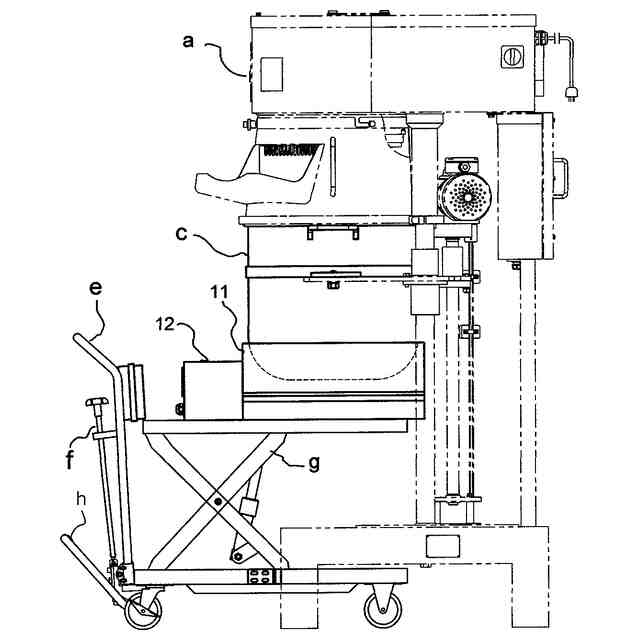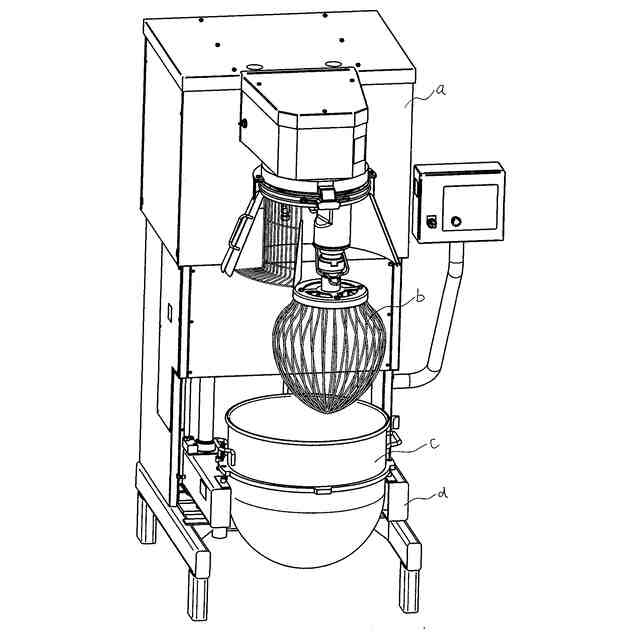 すなわち、これらの食材を図中のボウル(食材容器)cに入れて縦型ミキサーaの固定アームdにセットし、続いてボウルcの中に所定の攪拌子bを没入させて、食材の撹拌/混錬/泡立てなどの作業を行うのである。ちなみに、当該ミキサーが「縦型」と称される所以は、撹拌子を含む撹拌機構と食材を入れたボウルcが鉛直方向、つまり縦方向に配置されるためと言われている。