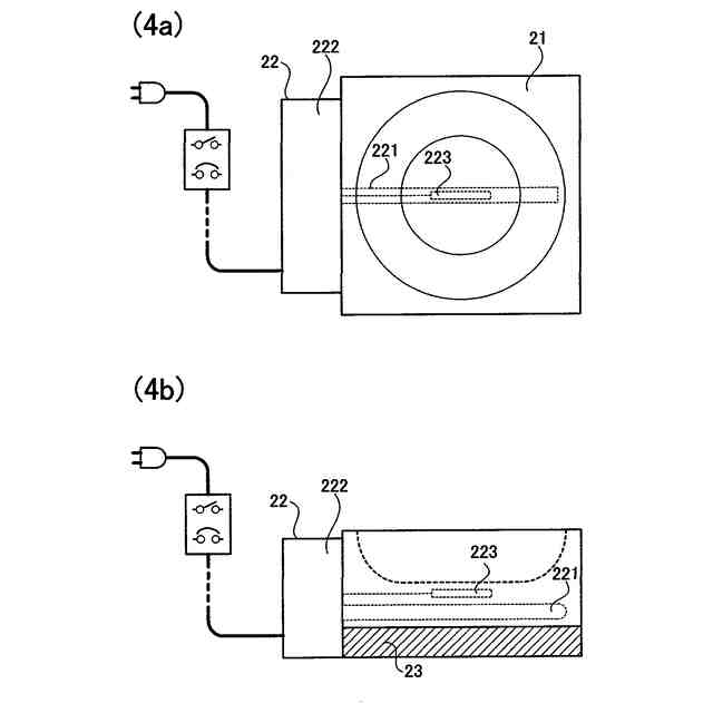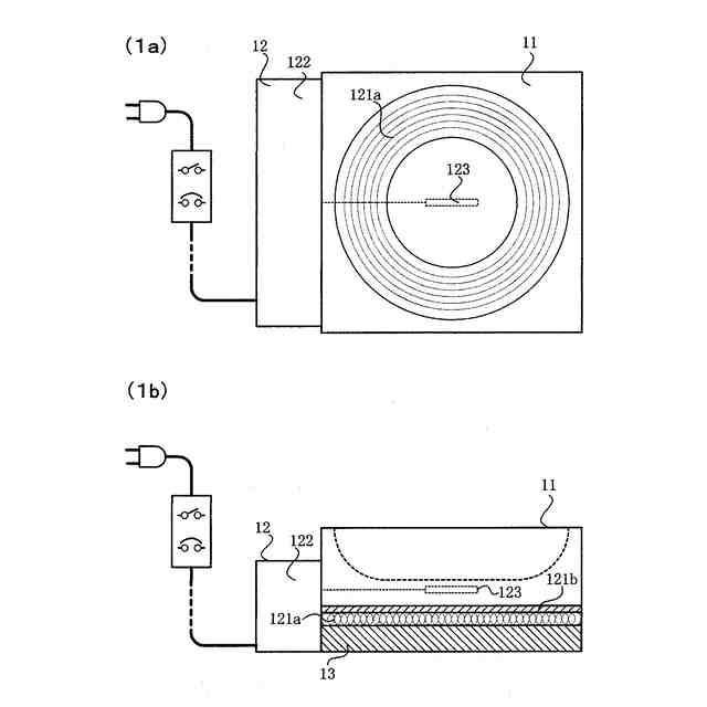 ちなみに、特許文献1に示された従来技術は、食材収容ボウル底面の外周面全体に多数の強磁性体の小板を分散配置し、電磁誘導コイルにより各々の強磁性体板を電磁誘導加熱してボウル内に収納された食材を加熱・保温するものである。しかしながら、食材収容ボウルにおいて電磁誘導版が当接された部位と、その他の部位で熱量分布にムラが生じやすく、極端な場合、電磁誘導版が当接された部位に相当するボウルの内側において、過剰加熱により被攪拌食材がボウルの内側に焦げ付いてしまうような事態が散見される。