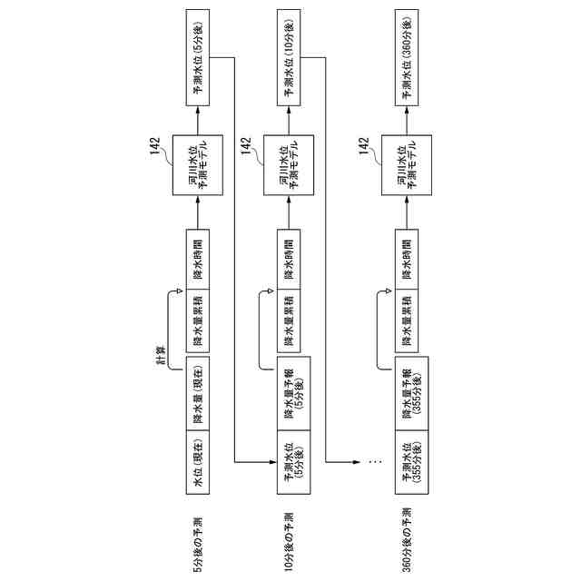 (4)本発明の一態様は、前記予測部は、各分割期間よりも前の分割期間の水位予測結果に基づいて各分割期間の水位を再帰的に予測することで前記所定時間における分割期間ごとの水位予測結果を生成する再帰的予測モデルに、対象河川の前記水位データ、前記降水量データ、前記降水量累積データ、および前記降水時間データを入力し、前記再帰的予測モデルの出力に基づいて未来の分割期間ごとの水位を予測し、現時点の前記水位データ、前記降水量データ、前記降水量累積データ、および前記降水時間データを入力し、現時点から前記所定時間に含まれる複数の未来の時点ごとに水位を予測する複数の時点予測モデルに、対象河川の前記水位データ、前記降水量データ、前記降水量累積データ、および前記降水時間データを入力し、前記複数の時点予測モデルの出力に基づいて未来の複数の時点における水位を予測し、前記再帰的予測モデルの出力および前記時点予測モデルの出力に基づいて対象河川における未来の水位を予測してよい。