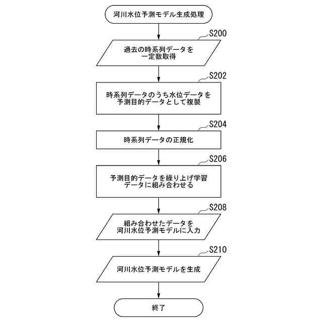 対象河川における前記水位データ、前記降水量データ、前記降水量累積データ、および前記降水時間データにより学習された個別河川水位予測モデルに、対象河川の前記水位データ、前記降水量データ、前記降水量累積データ、および前記降水時間データを入力し、前記個別河川水位予測モデルの出力に基づいて未来の水位を予測し、