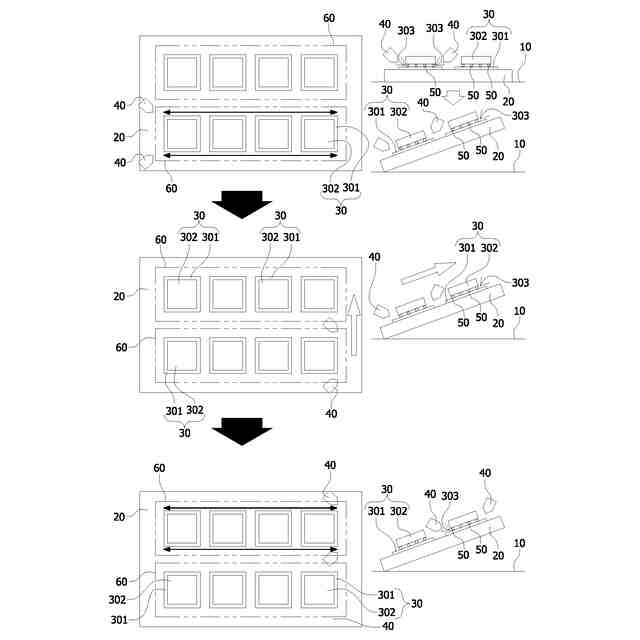 【解決手段】方法は、治具をコンベヤベルト搬送方向の一側へ下向きに傾斜させるステップ一、少なくとも二つのノズルを設定し、夫々清潔エリア内のチップ隙間を照準するステップ二、ノズルをチップの配列方向に沿って隙間を洗浄するステップ三、洗浄完了後、隣接清潔エリアが無ければ洗浄を終了し、隣接清潔エリアがある場合はノズルを同期移動させ当該区域内のチップ隙間を照準するステップ四、ステップ二とステップ三を繰り返し、全てのチップ隙間を洗浄するまで続けるステップ五及び治具を水平状態に戻した後、治具をコンベヤベルト搬送方向とは反対側へ下向きに傾斜させ、ステップ二からステップ五を繰り返して再度すべてのチップ隙間を洗浄するステップ六を含む。使用するノズルは流体ノズルである。