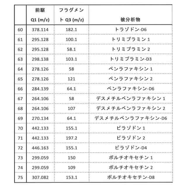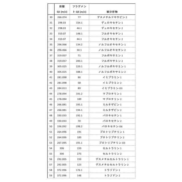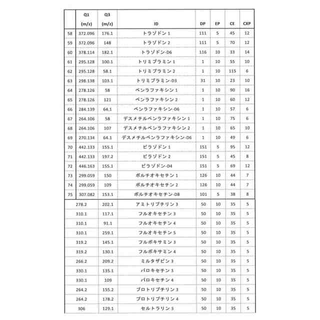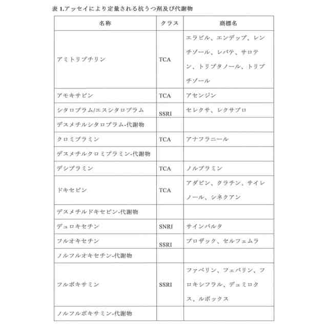 【解決手段】質量分析により検出できる1つ又は複数のイオンを生成するのに適する条件下で、試料をイオン化にかけるステップと、質量分析により1つ又は複数のイオンの量を決定するステップと、1つ又は複数のイオンの量を用いて、試料中の抗うつ剤又は抗うつ剤代謝物の量を決定するステップとを含む