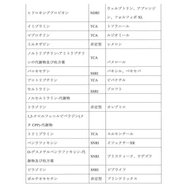 ン再取り込み阻害剤、三環系抗うつ剤、鎮静剤、並びに抗うつ剤代謝物代謝物を含む、請