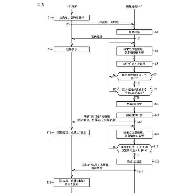 また、他の実施形態である情報提供方法は、移動端末へ情報を提供する情報提供方法であって、前記移動端末の位置情報、及び前記移動端末の位置する地域における気象情報を含む動的情報を逐次取得する動的情報取得ステップと、気象災害の発生が予測される気象状態である想定気象状態において気象災害の発生が予測される予測エリアを示すハザードマップ情報を含む静的情報を取得する静的情報取得ステップと、前記動的情報、及び前記静的情報に基づいて、前記移動端末のユーザに危険が及ぶ可能性がある危険エリアを前記予測エリアの中から定める設定ステップと、前記危険エリアに関する情報を前記移動端末へ送信する送信ステップと、を含み、前記設定ステップでは、逐次取得される情報が示す気象状態が前記想定気象状態に至る前に、前記危険エリアを定める。