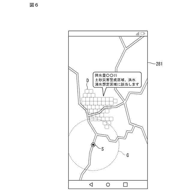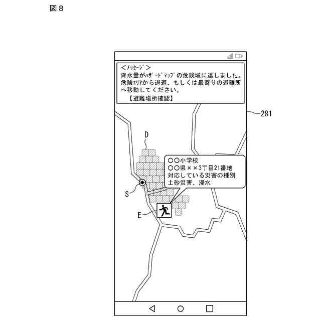 図8は、表示装置の表示画面を示す図であり、図7にて示したユーザ端末が危険エリア内に位置したまま、降雨量が想定降雨量を超えた場合を示している。