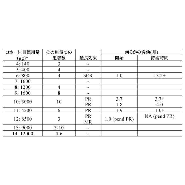 再発した状況における他の確立されたレジメンは、反復誘導レジメン又はボルテゾミブ若しくはアルキル化剤との免疫調節剤に基づくサルベージ組み合わせ療法である。再発疾患の患者において、転帰の改善(無進行生存率(PFS)及びOS)が必要である。確立された治療に応答せず、治療が進行している患者は、治療時にOSが9カ月、治療なしで3カ月という悲惨な転帰をもたらす。依然として対処されていないニーズは、これらの患者で最も高くなる。