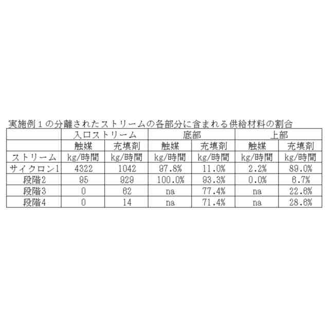 前記オーバーフロー画分を第2サイクロンに送り、第2ボトム画分と第2オーバーフロー画分を分離すること、ここで、前記第1サイクロンは触媒粒子に対して第1分離効率を有し、前記第2サイクロンは触媒粒子に対して前記第1分離効率よりも大きい第2分離効率を有し、前記第2ボトム画分は、前記第1の質量比よりも小さい第3の質量比を有する;