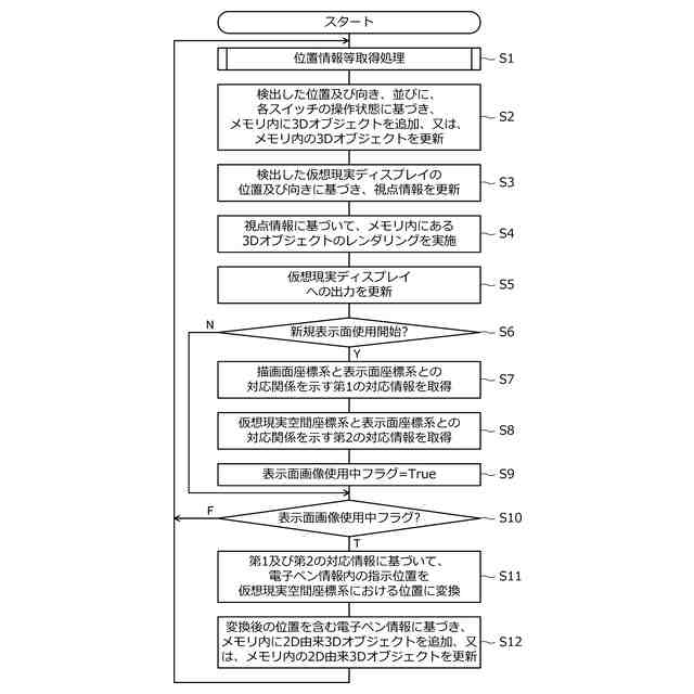 本発明の第2の側面によるレンダリング方法は、描画面上における電子ペンの位置を検出する位置検出装置と通信可能に構成され、メモリ内に記憶している3Dオブジェクトを仮想現実空間内にレンダリングするコンピュータによって実行されるレンダリング方法であって、表示面を構成する3Dオブジェクトを前記メモリ内に追加するステップと、前記メモリ内に記憶している1以上の3Dオブジェクトを前記仮想現実空間内にレンダリングするステップと、前記位置検出装置により検出された前記電子ペンの指示位置を前記仮想現実空間座標系における位置に変換するステップと、前記変換するステップによる変換後の前記電子ペンの指示位置に基づいて、前記描画面上に描かれた文字又は図形を前記表示面上に配置するステップと、を含むレンダリング方法である。