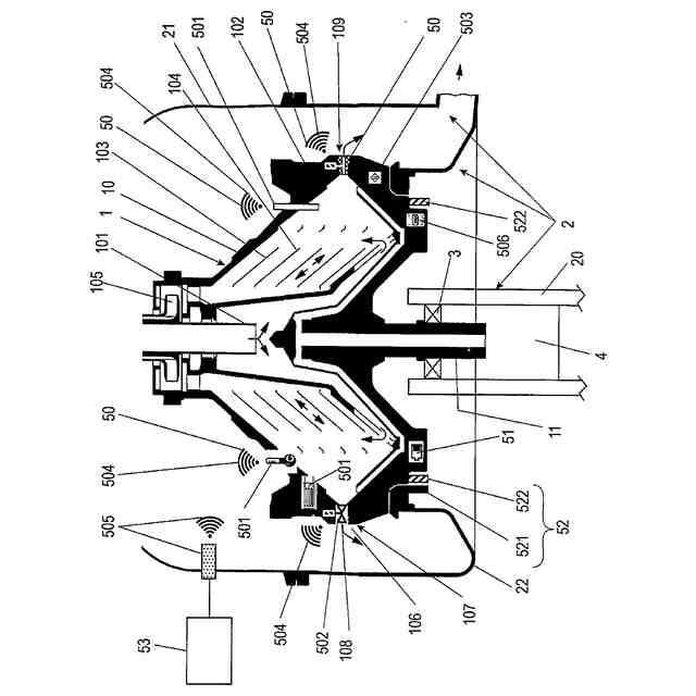 本発明による遠心分離機でもあるが、このような一般的な遠心分離機は、動作中に回転するか、又は作動中に回転可能なロータを有する。このロータは少なくとも1つの回転可能ドラムで構成され、その中で処理する懸濁液は別々の相に分離される。しかしながら、ロータはまた、駆動スピンドルのような他の要素を含んでもよい。ロータはまた、アクチュエータまたはエネルギ要求センサまたはイニシエータなど、少なくとも1つまたは複数の電気的消費要素(電気的な意味では負荷)を有し、従って該電気的消費要素は、作動中に回転するロータの他の要素または複数の要素と一緒に回転する。