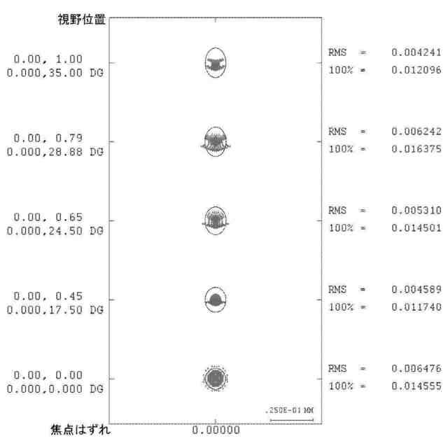 様々な視野高についての、図2の第1の実施の形態を用いた結像の回折限界品質を特徴付けるスポットダイアグラムを含む。