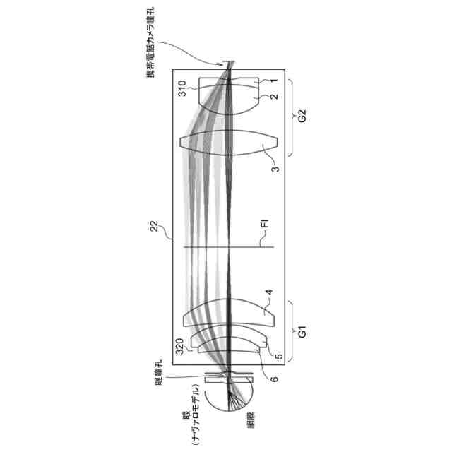 携帯型装置の出射瞳孔を補完し、携帯電話カメラ瞳の像を眼瞳孔上にリレーする、第1の実施の形態の光学列の概略図である。