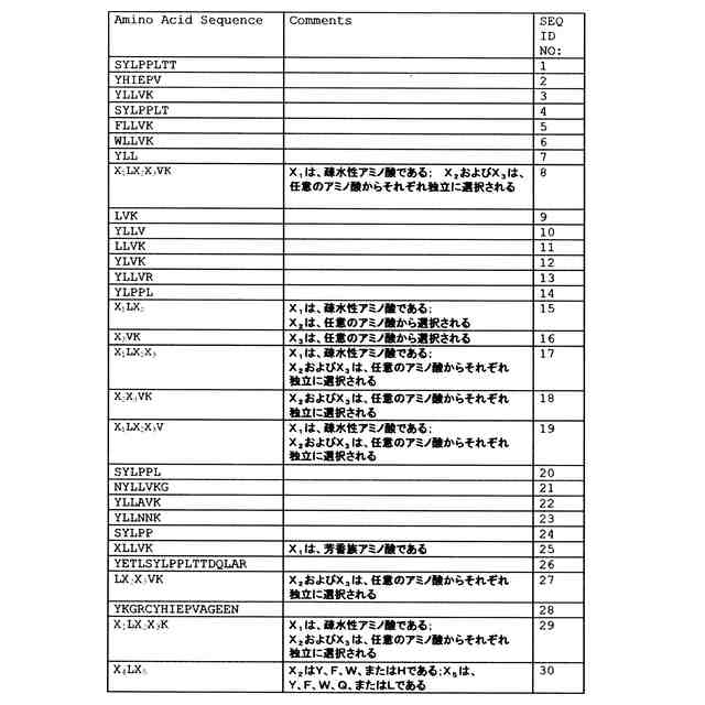 【解決手段】例えば、(i)アミノ酸配列SYLPPLTT(配列番号1)、(ii)アミノ酸配列YHIEPV(配列番号2)、(iii)アミノ酸配列YLLVK(配列番号3)、(iv)アミノ酸配列SYLPPLT(配列番号4)、(v)アミノ酸配列FLLVK(配列番号5)、および(vi)アミノ酸配列WLLVK(配列番号6)から選択される任意のアミノ酸配列を含むペプチドを提供する。