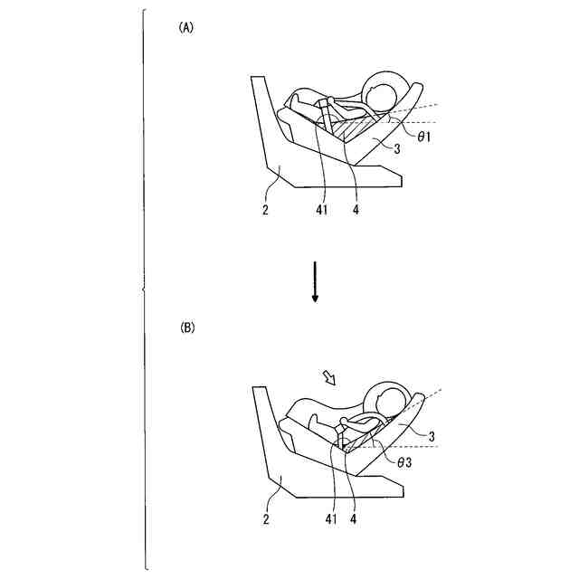 一般的に、たとえば1歳未満の首が座っていない子供をチャイルドシートに乗せる場合には、仰向けに近い状態で寝かせ、車両の進行方向に対して後ろ向きに保持し、ベルトでチャイルドシートに固定するようにしている。このような状態で、事故や急ブレーキなどによる前方からの衝撃を受けると、その反動で子供が前方に移動するため、その移動を抑制しようとして、衝撃が肩ベルトを介して子供の肩部分に集中する。