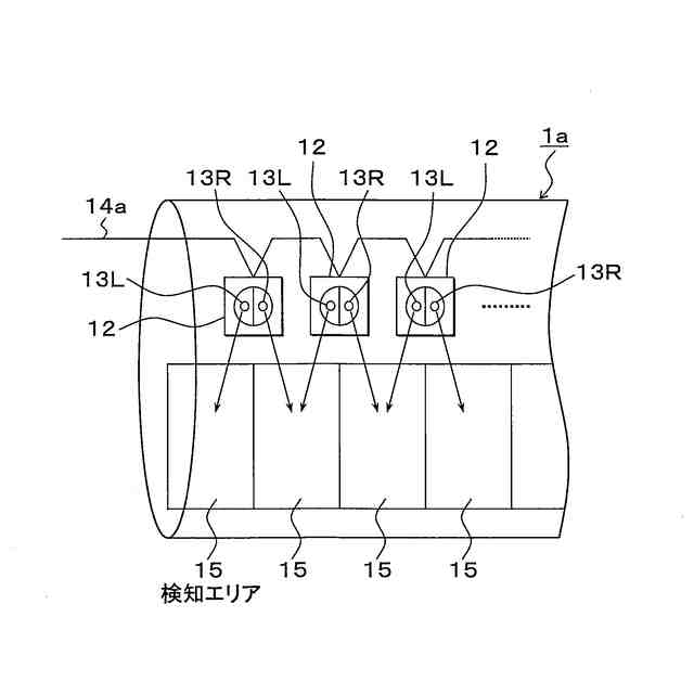 火災検知器は左右の両方向に検知エリアを持ち、トンネルの長手方向に沿って、隣接して配置される火災検知器との検知エリアが相互補完的に重なるように、例えば、25m間隔、或いは50m間隔で連続的に配置されている。