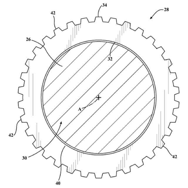 図1に最良に例示されるように、従来のクラッチシステム100は、典型的には、シャフト26に回転可能に連結された複数のクラッチプレート102を含み、複数のクラッチプレート102は、2つ以上の対向する回転面を、これらの表面間を選択的に界面摩擦係合させることにより噛み合わせるために使用される。各クラッチプレート102は、鋼からなり、かつ各クラッチプレート102がシャフト26に回転可能に連結されるようにシャフト26を受け入れるためのボアを画定するコアプレート104を含む。各クラッチプレート102は、コアプレート104の両側に配置された摩擦材料108を付加的に含み、これは、複数のクラッチプレート102間の意図された摩擦係合を実現する。