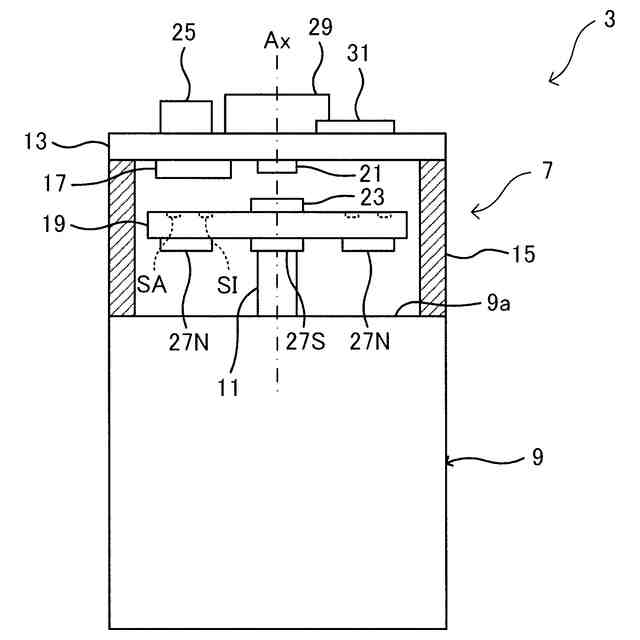 前記全固体電池と、前記全固体電池が電力を供給する前記多回転情報検出部と、が実装された前記基板上に実装される、