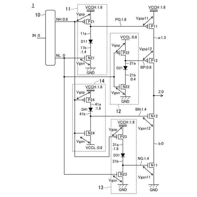 特許文献1では、低耐圧トランジスタを使用した高電圧信号を出力する出力回路の例が開示されている。この出力回路では、低耐圧トランジスタのゲート-ソース/ドレイン間やソース-ドレイン間に高電圧が直接かかることがないように構成されている。