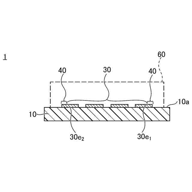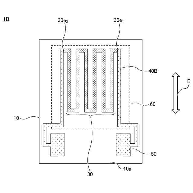 図1は、第1実施形態に係るひずみゲージを例示する平面図である。図2は、第1実施形態に係るひずみゲージを例示する断面図(その1)であり、図1のA-A線に沿う断面を示している。図3は、第1実施形態に係るひずみゲージを例示する断面図(その2)であり、図1のB-B線に沿う断面を示している。なお、図1に示す矢印Eは、ひずみゲージ1が貼り付けられる測定対象物のひずみ方向(伸縮方向)を示している。