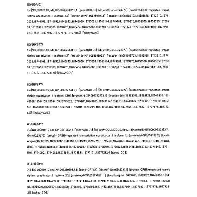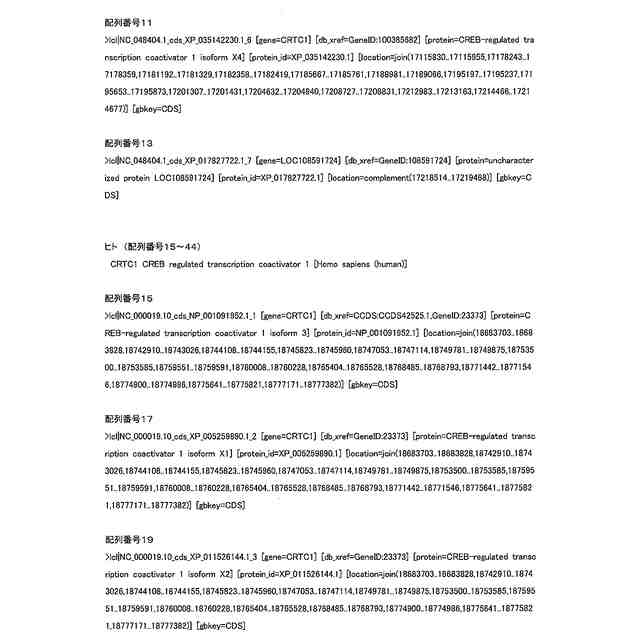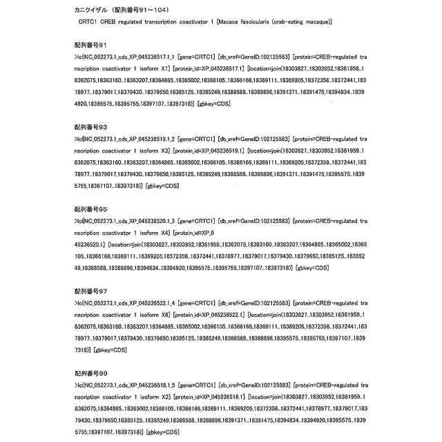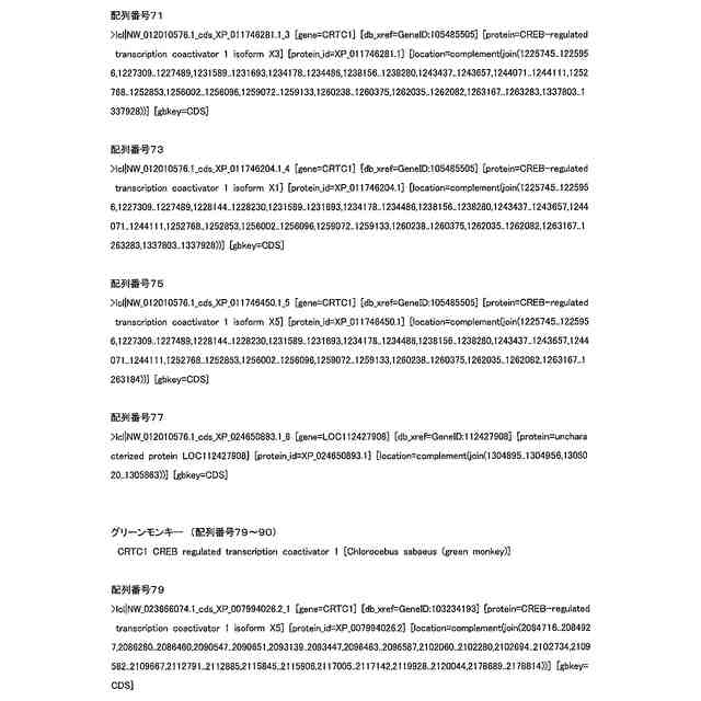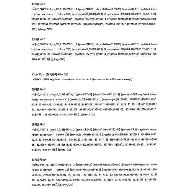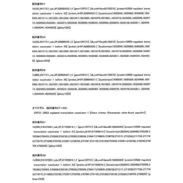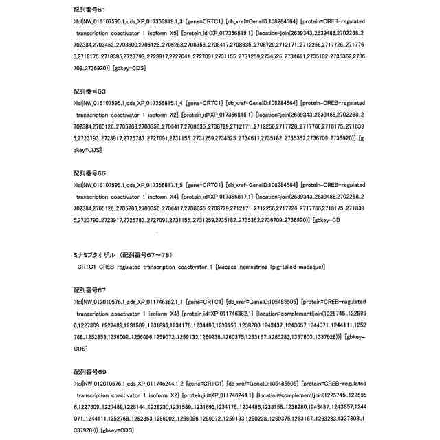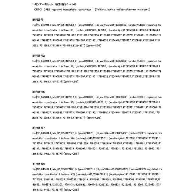 公開番号2025170454 公報種別公開特許公報(A) 公開日2025-11-19 出願番号2022158663 出願日2022-09-30 発明の名称てんかんモデル 出願人国立研究開発法人理化学研究所 代理人個人,個人,個人,個人 主分類A01K 67/027 20240101AFI20251112BHJP(農業;林業;畜産;狩猟;捕獲;漁業) 要約【課題】哺乳類動物のてんかんモデルを提供する。 【解決手段】哺乳類動物のてんかんモデルは、(i)CREB制御転写コアクチベータ1をコードする核酸の、RNA干渉する、特定の核酸配列を有するshRNAを、哺乳類動物の異なる3箇所以上の脳または脳神経の領域に注入する;あるいは、(ii)CREB制御転写コアクチベータ1をコードする核酸の、RNA干渉する、特定の核酸配列を有するshRNAを、哺乳類動物の異なる2箇所以上の脳または脳神経の領域に注入する、および、CREB制御転写コアクチベータ1をコードする核酸の、RNA干渉する、特定の核酸配列を有するshRNAを、哺乳類動物の異なる1箇所以上の脳または脳神経の領域に注入することを含む方法によって得られる。 【選択図】なし 特許請求の範囲【請求項1】 哺乳類動物のてんかんモデルであって、 (i)CREB制御転写コアクチベータ1(CRTC1)をコードする核酸の、配列番号1の塩基194-212に相当する配列を有する、RNA干渉するshRNA、または配列番号1の403-421に相当する配列を有する、RNA干渉するshRNAを、哺乳類動物の異なる3箇所以上の脳または脳神経の領域に注入する;あるいは、 (ii)CREB制御転写コアクチベータ1をコードする核酸の、配列番号1の塩基194-212に相当する配列を有する、RNA干渉するshRNAを、哺乳類動物の異なる2箇所以上の脳または脳神経の領域に注入する、および、CREB制御転写コアクチベータ1をコードする核酸の、配列番号1の403-421に相当する配列を有する、RNA干渉するshRNAを、哺乳類動物の異なる1箇所以上の脳または脳神経の領域に注入する、 ことを含む方法によって得られる、前記てんかんモデル。 続きを表示(約 1,400 文字)【請求項2】 てんかんが、(a)焦点起始発作型である、および/または、(b)構造的である、請求項1に記載のてんかんモデル。 【請求項3】 てんかんが、焦点起始発作型であり、そして、構造的である、請求項1に記載のてんかんモデル。 【請求項4】 CREB制御転写コアクチベータ1をコードする核酸の、配列番号1の塩基194-212に相当する配列を有する、RNA干渉するshRNAが、配列番号139の塩基配列、または配列番号139に対し1または2個の塩基が置換、付加、欠失または挿入した塩基配列を有する、請求項1-3のいずれか1項に記載のてんかんモデル。 【請求項5】 CREB制御転写コアクチベータ1をコードする核酸の、配列番号1の403-421に相当する配列を有する、RNA干渉するshRNAが、配列番号140の塩基配列、または配列番号140に対し1または2個の塩基が置換、付加、欠失または挿入した塩基配列を有する、請求項1-3のいずれか1項に記載のてんかんモデル。 【請求項6】 CREB制御転写コアクチベータ1をコードする核酸の、配列番号1の塩基194-212に相当する配列を有する、RNA干渉するshRNAが、配列番号139の塩基配列、または配列番号139に対し1または2個の塩基が置換、付加、欠失または挿入した塩基配列を有する、 ならびに、 CREB制御転写コアクチベータ1をコードする核酸の、配列番号1の403-421に相当する配列を有する、RNA干渉するshRNAが、配列番号140の塩基配列、または配列番号140に対し1または2個の塩基が置換、付加、欠失または挿入した塩基配列を有する、 請求項1-3のいずれか1項に記載のてんかんモデル。 【請求項7】 哺乳類動物が、霊長目、齧歯目または食肉目に属する動物である、請求項1-3のいずれか1項に記載のてんかんモデル。 【請求項8】 哺乳類動物が、霊長目に属する動物である、請求項1-3のいずれか1項に記載のてんかんモデル。 【請求項9】 哺乳類動物が、真猿下目に属する動物である、請求項1-3のいずれか1項に記載のてんかんモデル。 【請求項10】 哺乳類動物のてんかんモデルの作製方法であって、 (i)CREB制御転写コアクチベータ1をコードする核酸の、配列番号1の塩基194-212に相当する配列を有する、RNA干渉するshRNA、または配列番号1の403-421に相当する配列を有する、RNA干渉するshRNAを、哺乳類動物の異なる3箇所以上の脳または脳神経の領域に注入する;あるいは、 (ii)CREB制御転写コアクチベータ1をコードする核酸の、配列番号1の塩基194-212に相当する配列を有する、RNA干渉するshRNAを、哺乳類動物の異なる2箇所以上の脳または脳神経の領域に注入する、および、CREB制御転写コアクチベータ1をコードする核酸の、配列番号1の403-421に相当する配列を有する、RNA干渉するshRNAを、哺乳類動物の異なる1箇所以上の脳または脳神経の領域に注入する、 ことを含む、前記方法。 (【請求項11】以降は省略されています) 発明の詳細な説明【技術分野】 【0001】 本発明は、てんかんモデル、並びに、当該てんかんモデルの作製方法およびその使用に関する。 続きを表示(約 26,000 文字)【背景技術】 【0002】 てんかんは、世界人口の0.4~1%が罹患する主