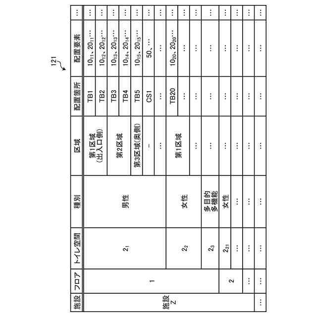 前記トイレ空間は、第1フロアに設けられる1つ又は複数の第1トイレ空間と、第2フロアに設けられる1つ又は複数の第2トイレ空間とを含み、