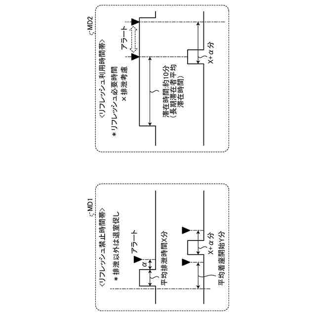例えば、一般にオフィスでは、午前中特に朝一番や昼食前後は排泄目的の利用者が多く、混雑を回避できるトイレ利用者の回転率向上がのぞまれる。一方で昼食後所定時間経過後~終業時間までは業務で蓄積した疲労をリセットするために執務室からはなれ、排泄に加えてリフレッシュ目的にトイレを利用することが多い。また、大学などの学校系では、授業の合間は排泄目的で利用者の集中が多い一方で、授業中は履修していない人がゆったり利用される。そこで、トイレ管理システムは、トイレブースの利用に関して複数の時間を設定することにより、それぞれの目的に応じた時間帯とその時の利用時間を設定することが可能となり、トイレ管理システムが管理するトイレ空間においてはトイレブース内の利用者も次の利用者も快適に利用することを可能にすることができる。