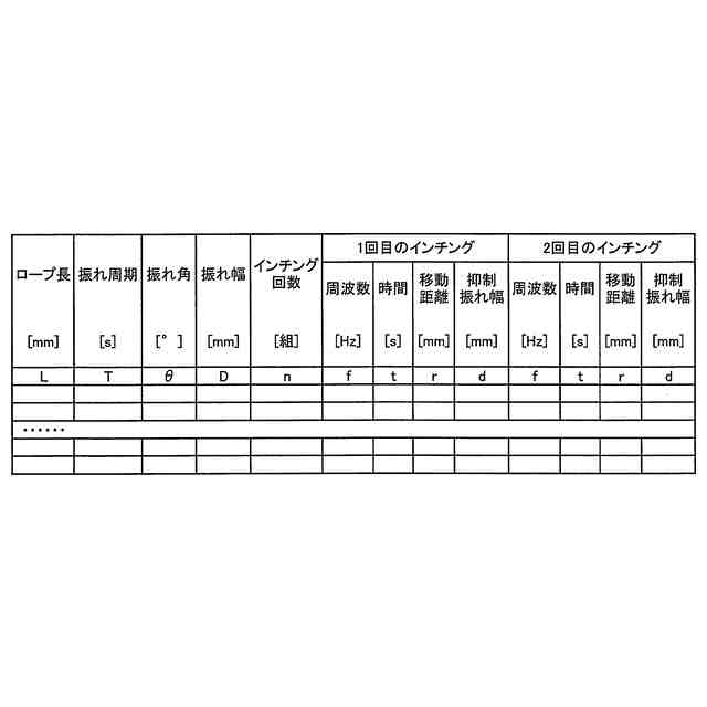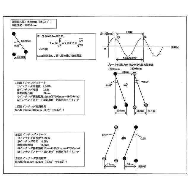 前記クレーンの目的位置到達後、クレーンが一旦停止した状態で、ロープ長L[mm]及び振れ角θ[°]から振れ周期T[s]及び振れ幅D[mm]を測定し、