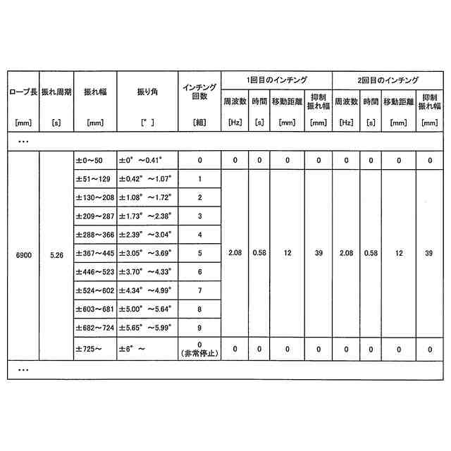 前記測定した振れ周期T[s]及び振れ幅D[mm]に基づき、予め用意したインチングテーブルのインバータがモータに与えるインチング回数n[回]、インチング周波数f[Hz]、インチング時間t[s]、インチング移動距離r[mm]及び抑制振れ幅d[mm]をパラメータとして選定、設定し、